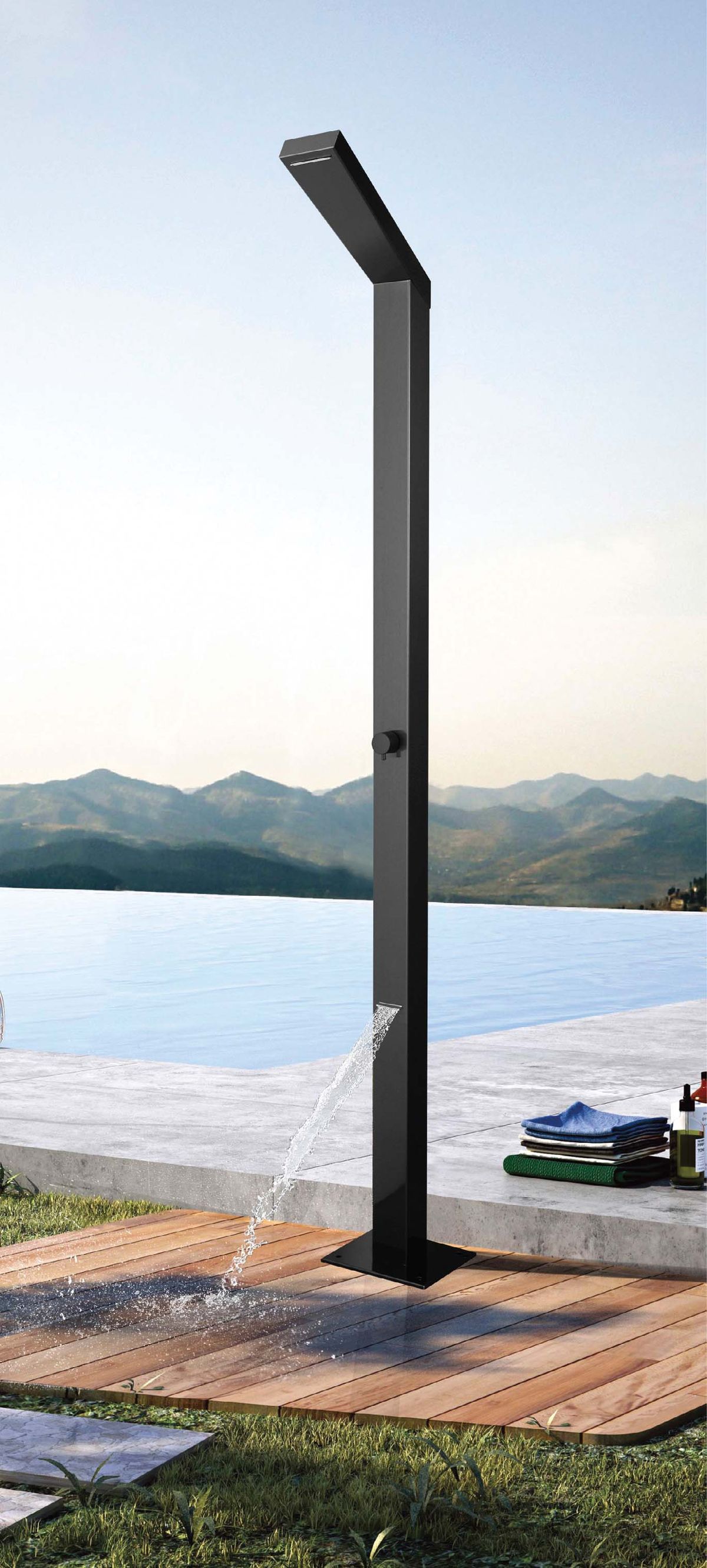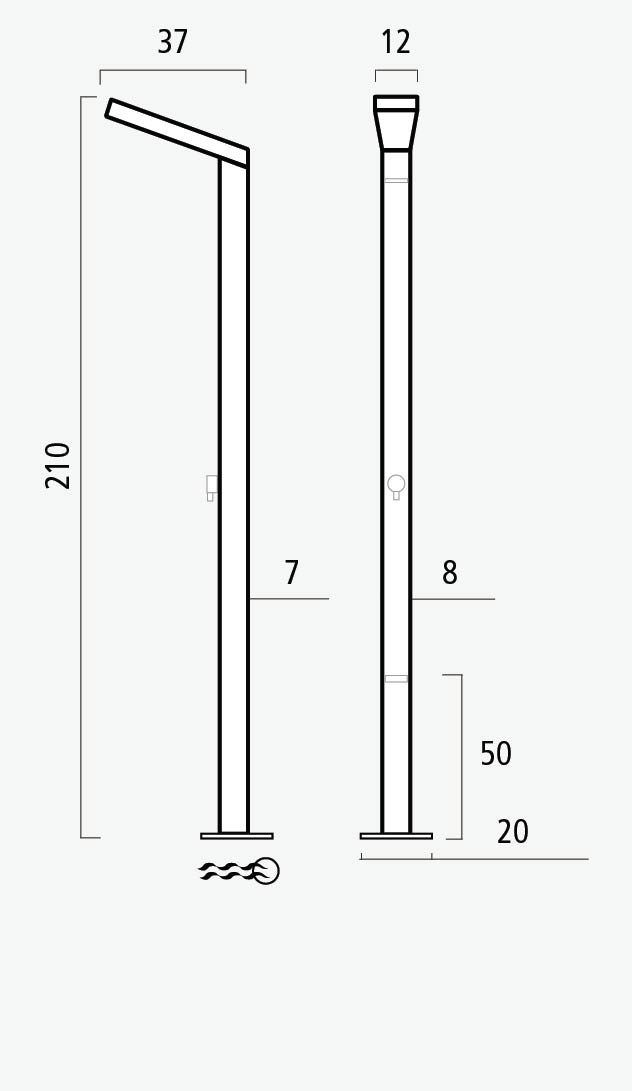 Columna de ducha fabricado en acero inoxidable preparada para su instalación en suelos de zonas exterior, terrazas, jardines, piscinas públicas y privadas.